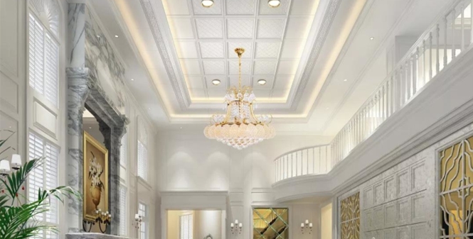 挑高客廳的空間大,如果頂部裝飾少,會顯得很空洞??梢栽陧敳垦b上集成吊頂,來彰顯你的品味。注意在選擇集成吊頂?shù)臅r候要和家中的整體風格進行匹配。