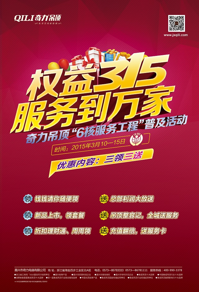 2015年3月15日,奇力吊頂,集成吊頂行業(yè)客廳吊頂領(lǐng)導(dǎo)者,暖風(fēng)電器領(lǐng)導(dǎo)者,國家與行業(yè)標(biāo)準(zhǔn)起草單位,在消費(fèi)者權(quán)益保護(hù)日這年度最重要的日子里,旗幟鮮明的推出了全國聯(lián)動的“權(quán)益315 服務(wù)到萬家——奇力吊頂“6核服務(wù)工程”普及活動,領(lǐng)袖,必定承擔(dān)超越同行的責(zé)任!