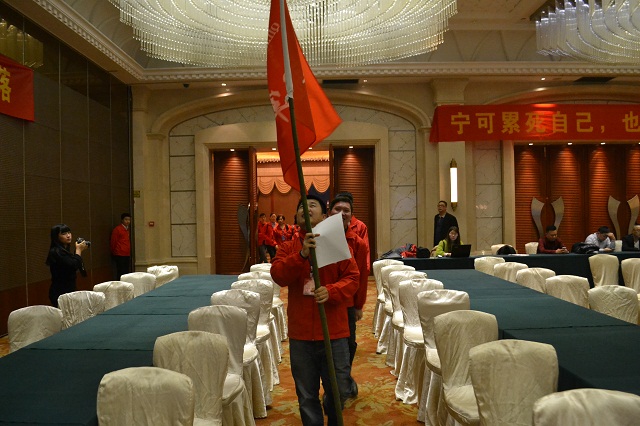 傍晚18:30,全國(guó)經(jīng)銷商身著奇力吊頂紅色戰(zhàn)衣,用井然有序的四個(gè)方陣步入會(huì)場(chǎng),本次大會(huì)分為四大隊(duì)伍:戰(zhàn)神隊(duì)、奇跡隊(duì)、冠軍隊(duì)、超人隊(duì)。每個(gè)隊(duì)伍由十幾個(gè)地區(qū)的優(yōu)秀經(jīng)銷商代表組成,他們將在今明兩天的活動(dòng)中為各自的隊(duì)伍“參戰(zhàn)”,奮力贏取積分。