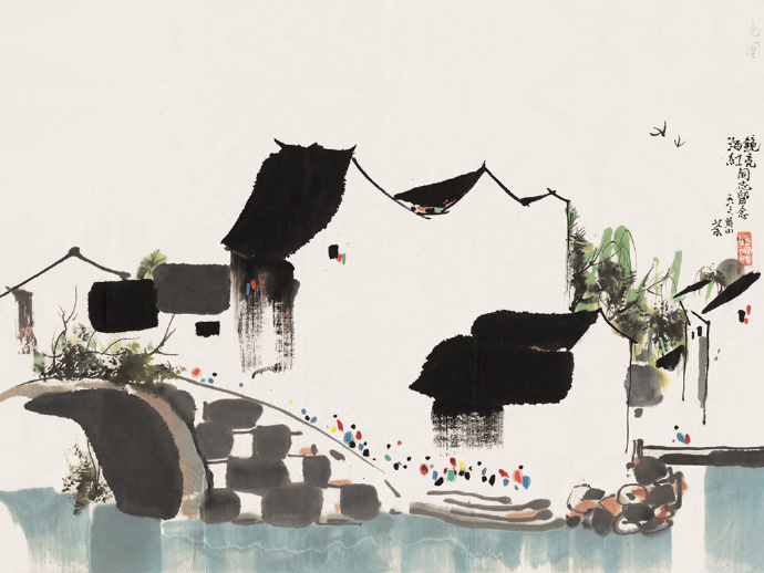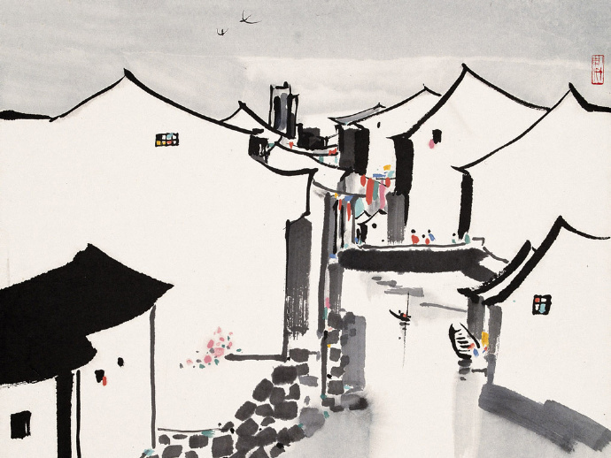 在吳冠中的作品中,充滿中國傳統(tǒng)水墨的神韻和西方現(xiàn)代表現(xiàn)手法的視覺沖擊力,他用畫來表現(xiàn)中國傳統(tǒng)的東方意蘊。